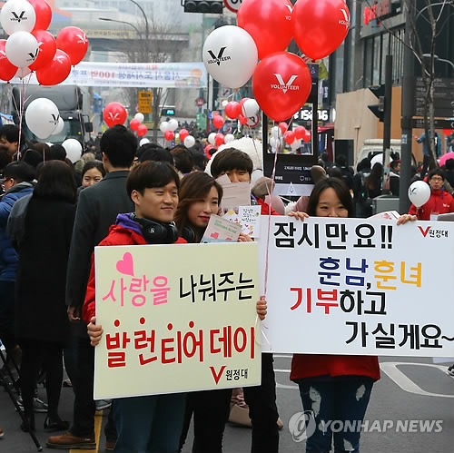 | △ (서울=연합뉴스) 황광모 기자 = 14일 오후 서울 신촌 차없는 거리에서 열린 제5회 '발런티어데이' 기념 캠페인에서 대학생 자원봉사단체 'V 원정대' 단원들이 밸런타인데이를 맞이해 거리로 나온 시민들에게 기부를 실천하는 '발런티어데이'를 소개하고 있다. 2015.2.14 hkmpooh@yna.co.kr |