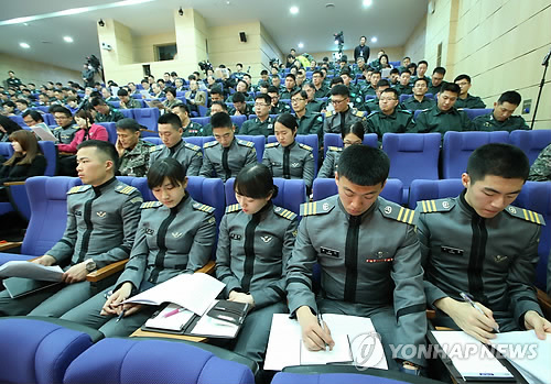 | △ 국방부가 사관생도들의 흡연을 일부 허용하는 방안을 검토하자 육군 측은 긍정적인 반응을 보인 것으로 알려졌다. 사진은 육사 3금(금주.금연.금혼)제도 효용성 분석 및 발전방향 공청회에서 사관생도 등 참석자들이 발표자료를 살펴보고 있다. (연합뉴스 자료사진) |