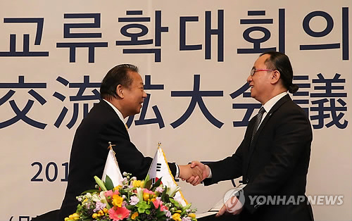| △ 한-일 관광교류확대 선언 조인식 (서울=연합뉴스) 14일 서울 잠실 롯데호텔에서 ‘한일관광교류확대회의 in 서울’행사에서 변추석 한국관광공사 사장(오른쪽)과 일본전국여행업협회 회장인 니카이 도시히로 일본 자민당 총무회장이 한일국교정상화 50주년 기념, 한일관광교류확대 선언문에 서명한 뒤 서로 교환하고 있다. (문화체육관광부제공) |