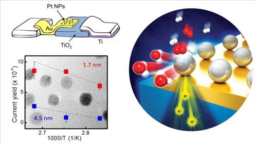 연구진은 열전자 흐름을 측정하기 위해 얇은 금 박막과 이산화티타늄(TiO₂) 층으로 이루어진 나노다이오드 표면 위에 크기가 1.7나노미터(㎚=10억분의 1m)와 4.5㎚인 백금 나노촉매를 2차원 단층으로 배열해 나노촉매 소자 시스템을 만들었다.