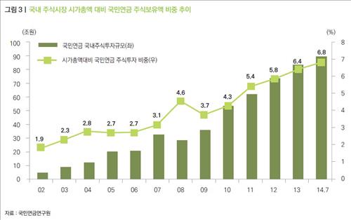 국민연금 기금 국내 주식투자의 시가총액 대비 비중은 2003년 2.3%, 2007년 3.1%, 2011년 5.4% 등으로 꾸준히 늘고 있다. 기금의 국내 주식투자 규모는 2003년말 9조원에서 2014년 7월 90.1조원으로 10배 이상 증가했다.