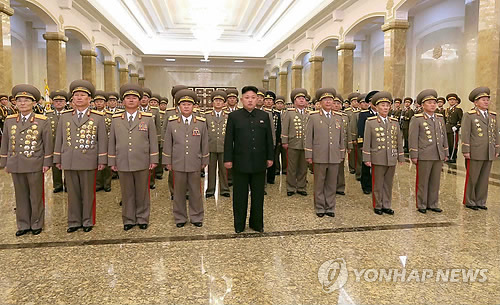 | △ 김정은 국방위원회 제1위원장이 지난해 2월 16일 0시 군 지휘부를 대동하고 김일성 주석과 김정일 국방위원장의 시신이 안치된 금수산태양궁전을 참배하는 모습.<<연합뉴스DB>> |