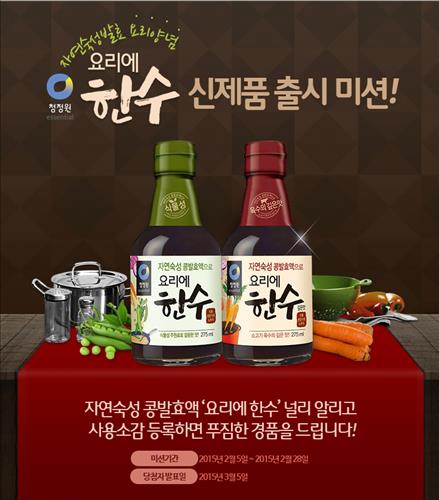 (서울=연합뉴스) 최이락 기자 = 대상 청정원은 자연숙성 콩발효액을 토대로 한 액상 조미료 '요리에 한수' 출시를 기념해 오는 28일까지 응모자 전원에게 100% 경품을 제공하는 이벤트를 진행한다고 16일 밝혔다.