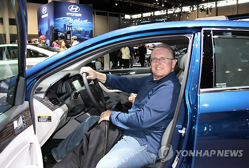 | △ (시카고=연합뉴스) 김 현 통신원 = 미국 시카고 교외에 거주하는 앨런 폴라 씨가 14일(현지시각) 개막한 시카고 오토쇼 현대차 전시실에서 소나타에 탑승해보고 있다. 그는 "실내 공간이 넓은 차를 원한다. 현대차는 이 요구를 만족시킨다"고 말했다. 2015.2.16 chicagorho@yna.co.kr chicagorho@yna.co.kr |