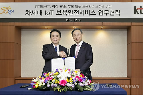 KT는 16일 경기 분당사옥에서 황창규 회장과 남경필 경기지사가 참석한 가운데 경기도와 '차세대 IoT 보육안전서비스 제공을 위한 업무협약(MOU)'을 체결했다.