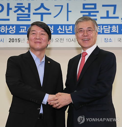 | △ 새정치민주연합 문재인 대표(오른쪽)와 안철수 전 공동대표가 지난 1월 13일 국회 의원회관에서 안철수 의원 주최로 열린 신년 특집 좌담회에서 만나 악수하고 있다. |
