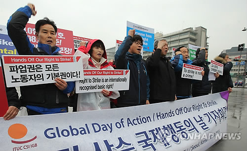 민주노총이 4월 총파업을 결의한 가운데 이날 회견은 국제노총(ITUC)이 노조의 파업할 권리를 강조하기 위해 정한 '파업권 사수 국제공동행동의 날'인 18일을 앞두고 열렸다.