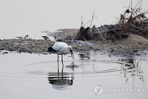| △ 먹이 찾으러 고향 온 탈출황새 '미호' (청주=연합뉴스) 지난해 4월 한국교원대 청람 황새공원을 탈출한 천연기념물 제199호인 황새가 지난 14일 오전 청주 미호천 인근에서 사진작가에 의해 포착됐다. 교원대 측은 탈출황새가 올봄 고향인 청주 미호천 습지로 날아오길 기대하는 마음에서 'B49'번 인식표를 단 이 황새의 이름을 '미호'로 지은 바 있다. 사진은 조류사진작가 김준수 씨가 찍은 미호의 모습. 2015.2.15 <<조류사진작가 김준수씨 제공>> sweet@yna.co.kr |