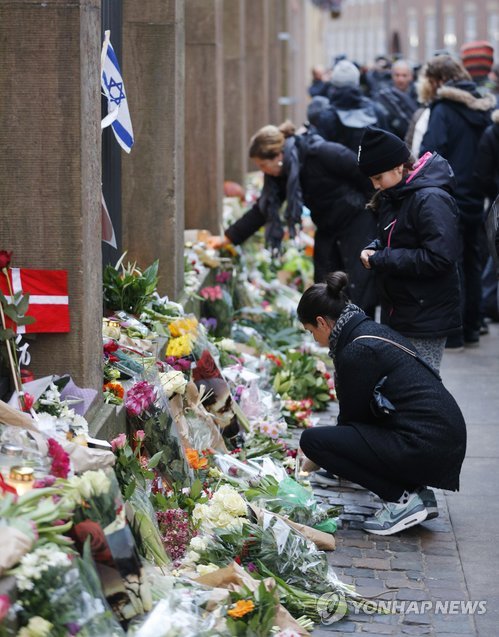 | △ 코펜하겐의 애통 (AP=연합뉴스) 총격테러가 발생한 덴마크 코페하겐의 유대교 회당 앞에 15일(현지시간) 행사 출입관리 일을 하다 숨진 단 우산 씨의 죽음을 애도하는 발걸음이 끊이지 않고 있다. marshal@yna.co.kr Flowers lay in front of the synagogue where one person was killed in Copenhagen, Denmark, Sunday, Feb.15, 2015. The alleged shooter was later killed by police who believe he also shot another person at a cultural center. (AP Photo/Michael Probst). |