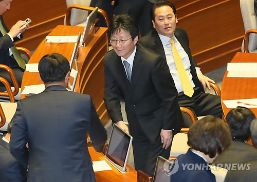 | △ 인사하는 유승민 (서울=연합뉴스) 진성철 기자 = 새누리당 유승민 원내대표가 16일 국회 본회의장에서 '이완구 국무총리 후보자 임명동의안'에 대한 투표를 마친 뒤 의원들과 인사하고 있다. |