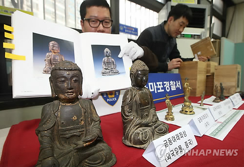서울 마포경찰서는 모조품인 가짜 통일신라시대 석가모니 금동불상, 고려말 금동 좌불 석가모니상 등 7점을 30억원에 판매하려 한 혐의(사기미수 등)로 원모(38)씨를 구속했다고 17일 밝혔다. 원씨는 마약을 상습투약한 혐의도 받고 있다.