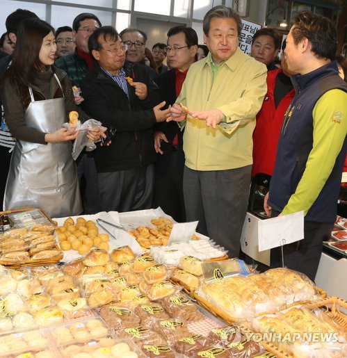 | △ 새누리당 김무성 대표가 설 명절을 앞두고 지난 15일 경기도 하남시 신장전통시장을 방문, 이정현 최고위원과 함께 빵가게에서 주인과 대화하고 있다. |