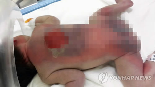 | △ 병원 인큐베이터에서 중화상 입은 신생아 (안동=연합뉴스) 이덕기 기자 = 경북 안동의 한 산부인과 병원에서 신생아 두 명을 전기 매트 위에 올려놓고 제대로 돌보지 않아 아이들이 중화상을 입는 사고가 일어났다. 사진은 4도의 중화상을 입은 이모(29)씨의 딸. 2014.9.12 duck@yna.co.kr |
