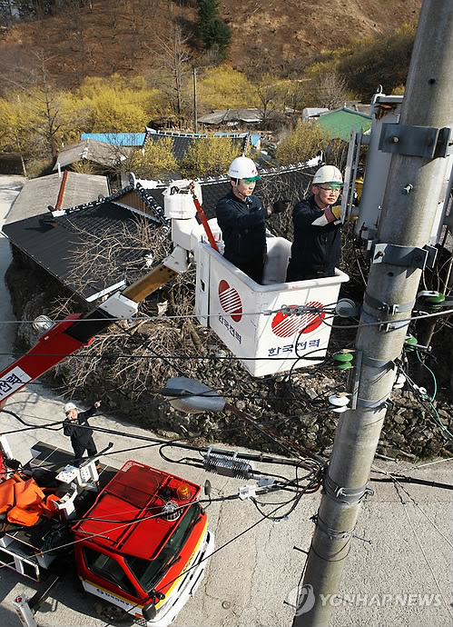 | △ 한전, 설 연휴 1천800명 비상근무 돌입 (서울=연합뉴스) 한국전력공사 직원들이 설 연휴 기간 정전 예방을 위해 주요 배전선로를 특별 점검하고 있다. (한전 제공) |