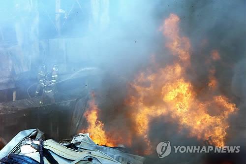 | △ (천안=연합뉴스) 양영석 기자 = 소방 구급대원들이 지난달 18일 충남 천안의 한 부탄가스 제조 공장에서 발생한 화재를 진압하고 있다. 2015.1.18 |