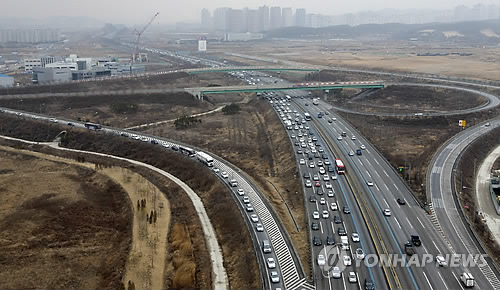 | △ (평택=연합뉴스) 윤동진 기자 = 설 연휴를 하루 앞둔 17일 오후 경찰청 귀성길 점검 헬기에서 바라본 평택 부근 경부고속도로가 귀성길 차량으로 막히고 있다. |