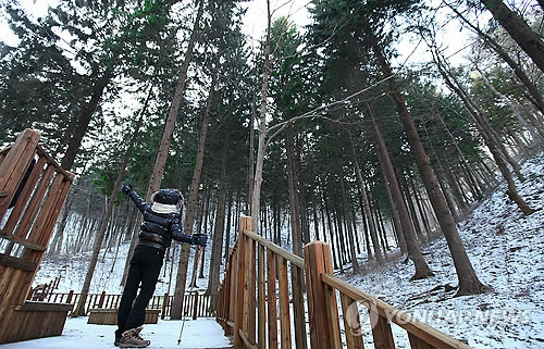 | △ (서울=연합뉴스) 성연재 기자 = 길다면 길고 짧다면 짧은 5일 설 연휴. 바로 귀경하지 않고 경로상 여행을 즐기려는 사람들이 늘고 있다. 이미 만석이 된 휴양림은 트레킹만 즐기고 인근에서 숙박하며 즐길 수 있다. 사진은 겨울 정취 가득한 덕유산 독일가문비나무 군락지 트레킹. 2015.2.18 polpori@yna.co.kr |