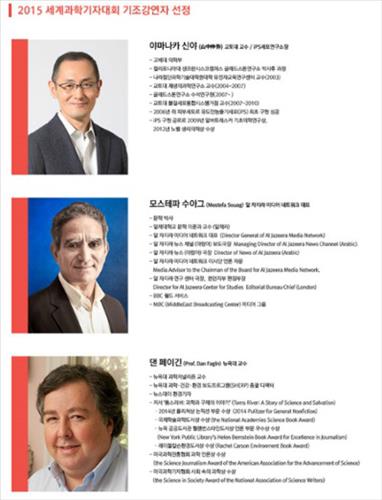 유도만능줄기세포(iPS) 연구로 2012년 노벨 생리의학상을 받은 일본 교토 야마나카 신야 iPS 세포연구소장이 기조 강연을 한다. 또 중동의 CNN으로 불리는 알자지라의 모스테파 수아그(Mostefa Souag) 국장, '과학과 구제의 이야기(Toms River: A Story of Science and Salvation)'로 퓰리처상을 받은 댄 페이긴 뉴욕대 언론학부 교수가 기조강연을 한다.