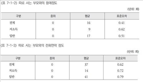 그 결과 저소득 가구는 평균 9회, 일반 가구는 연간 평균 17회 부모와 왕래하는 것으로 조사됐다.