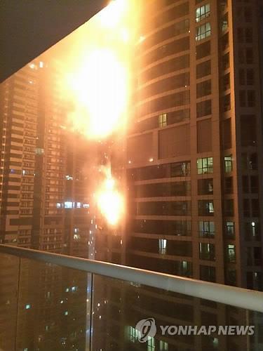 (두바이=연합뉴스) 강훈상 특파원 = 21일(현지시간) 아랍에미리트(UAE) 두바이의 세계 최고층 아파트에서 큰 불이 났으나 다행히 인명피해는 없었다.
