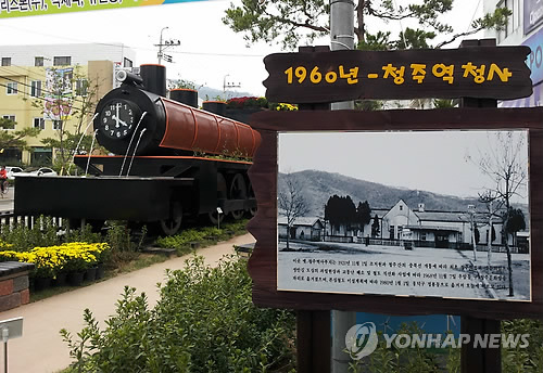 | △ 청주 도심에 등장한 추억의 기관차 (청주=연합뉴스) 변우열 기자 = 청주시는 1968년까지 청주역이 있던 상당구 북문로에 `옛 청주역사공원'을 조성했다. 이곳에는 실물크기의 기관차 모형과 옛 청주역사 사진 등이 설치돼 있다. 2012.10.5 bwy@yna.co.kr |