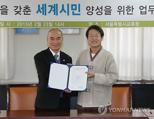 | △ 서울교육청-굿네이버스, 세계시민양성 업무협약 (서울=연합뉴스) 조희연 서울시교육감(오른쪽)과 이일하 국제구호개발기구 굿네이버스 회장이 23일 오후 서울 종로구 서울시교육청에서 '따뜻한 인성을 갖춘 세계시민 양성을 위한 업무협약'을 체결하고 있다. (서울시교육청 제공) |