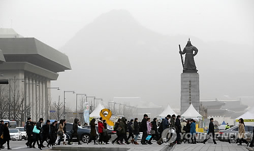 | △ 중국발 황사로 희뿌연 도심 (서울=연합뉴스) 임헌정 기자 = 23일 중국발 황사가 한반도를 뒤덮은 가운데 서울 종로구 세종로네거리에서 시민들이 출근길을 서두르고 있다. |