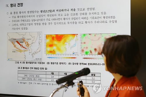 | △ 기상청 봄철 기상전망 브리핑 (서울=연합뉴스) 김도훈 기자 = 23일 오전 서울 동작구 기상청에서 김현경 기후예측과장이 2015년 봄철 기상전망 브리핑을 하고 있다. |