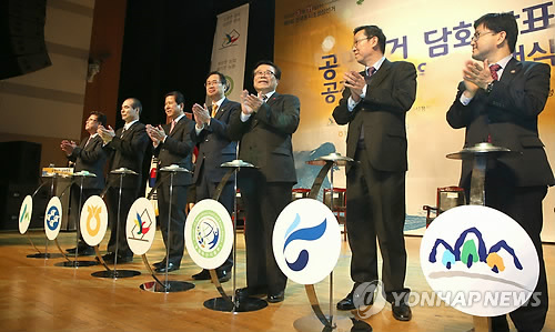 | △ 오는 3월11일 실시하는 제1회 전국동시조합장선거를 앞두고 지난 1월 29일 오후 서울 마포구 대흥동 마포아트센터에서 열린 공명선거 담화발표 및 공정선거지원단 발대식에서 참가자들이 공정선거를 다짐하며 터치 버튼을 누른 뒤 박수를 치고 있다. |