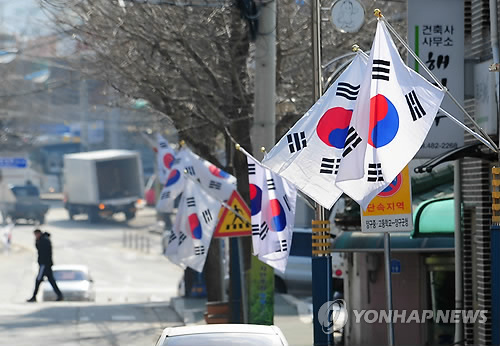 | △ 3.1절까지 태극기 달기 운동 (양구=연합뉴스) 태극기가 나부끼는 강원도 양구군 거리.2015.2.5 <<양구군>> dmz@yna.co.kr |