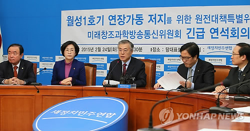 | △ (서울=연합뉴스) 진성철 기자 = 새정치민주연합 문재인 대표가 24일 국회에서 열린 '월성1호기 연장가동 저지를 위한 원전대책특별위원회와 미래창조과학방송통신위원회 긴급연석회의'에서 모두발언하고 있다. |