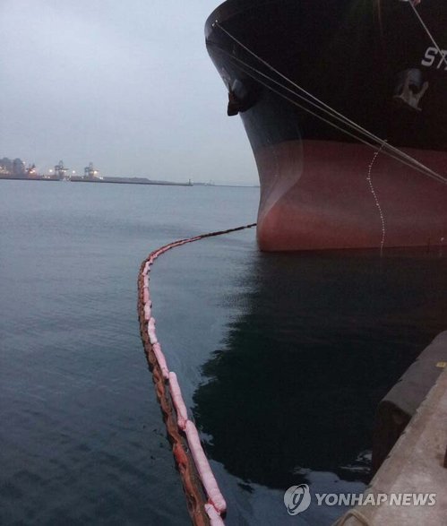| △ 포항 앞바다 기름 유출 (포항=연합뉴스) 경북 포항신항 앞바다에 정박 중인 대형화물선에서 기름을 넣던 중 벙커C유 1천400ℓ 가량이 바다로 유출돼 당국이 방제작업을 벌이고 있다. 2015.2.24 << 포항해양경비안전서 >> shlim@yna.co.kr |