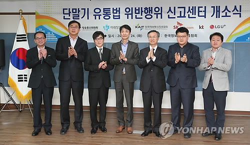 | △ '단통법' 위반행위 신고센터 개소 (서울=연합뉴스) 박지호 기자 = 24일 오전 서울 서초구 서초동 한국정보통신진흥협회에서 열린 '단말기 유통법 위반행위 신고센터 개소식'에서 참석자들이 기념촬영을 하고 있다. |