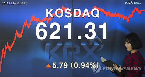 | △ 코스닥 지수 620선 돌파 (서울=연합뉴스) 윤동진 기자 = 24일 코스닥 지수가 전 거래일보다 5.79p(0.94%) 오른 621.31로 거래를 마친 가운데 서울 영등포구 한국거래소 대형스크린 앞을 직원이 지나고 있다. |