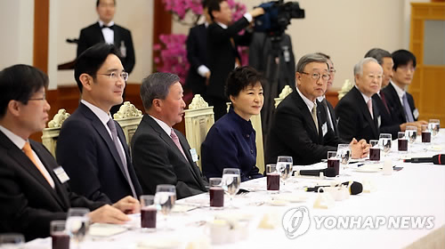 이날 오찬에는 이재용 삼성전자 부회장, 정의선 현대자동차 부회장, 허동수 GS칼텍스 회장, 구본무 LG그룹 회장, 손길승 SK텔레콤 명예회장, 신동빈 롯데그룹 회장, 조양호 한진그룹 회장, 박삼구 금호아시나그룹 회장, 손경식 CJ그룹 회장, 조현상 효성그룹 부사장 등 재벌그룹 오너와 유수기업 대표 21명이 참석했다.