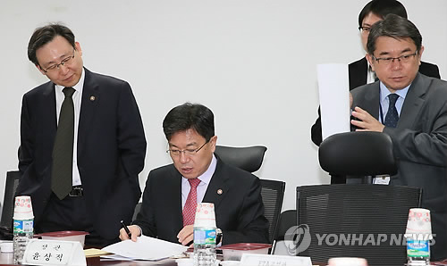 | △ 논의하는 산자부 (서울=연합뉴스) 진성철 기자 = 윤상직 산업통상자원부 장관(왼쪽 두 번째), 문재도 제2차관 등이 25일 국회 의원회관에서 열린 한·중 FTA 주요 동향보고 관련 산자위 당정협의에서 논의하고 있다. |