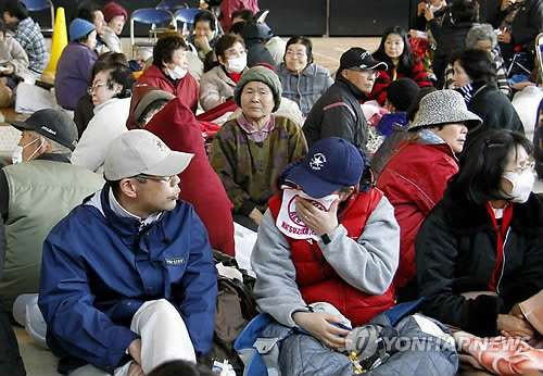 | △ 2011년 3월 12일 일본 후쿠시마현 나미에마치에서 원전 폭발에 대비해 피난한 주민들이 불안해 하고 있다. (교도=연합뉴스 자료사진) |