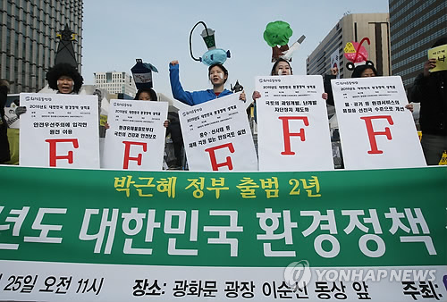 (서울=연합뉴스) 설승은 기자 = 환경운동연합은 25일 서울 광화문광장에서 기자회견을 열어 "박근혜 정부 출범 후 2년간의 환경·에너지 공약과 관련 정책을 평가해 점수를 매긴 결과 낙제점을 주겠다"고 밝혔다.