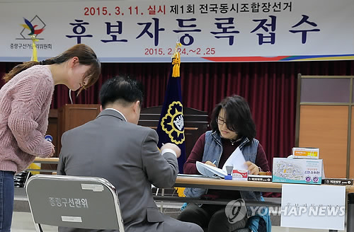 | △ 전국 동시 조합장 선거 후보자 등록 (서울=연합뉴스) 이정훈 기자 = 내달 11일 실시되는 제1회 전국 동시 조합장선거 후보자 등록 첫날인 24일 오전 서울 중랑구 신내로 중랑구선거관리위원회에서 한 후보자가 등록을 하고 있다. |