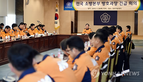 | △ 조송래 국민안전처 중앙소방본부장이 지난달 20일 서울 종로구 정부서울청사에서 겨울철 화재예방 및 대응활동 강화를 위한 전국 소방본부 방호과장 긴급회의를 주재하고 있다. |
