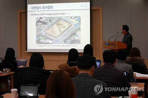 | △ 용산 보도침하 관련 주변도로 지반탐사 결과 발표 (서울=연합뉴스) 박동주 기자 = 26일 오전 서울 시청 신청사에서 이택근 도로관리과장이 용산역 앞 보도침하와 관련 주변도로 지반탐사 결과를 발표하고 있다. |