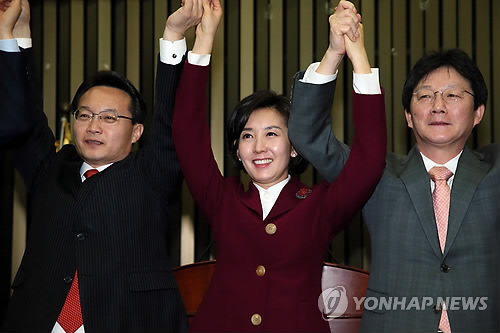 | △ 새누리, 국회 외통위원장 후보로 나경원 선출 (서울=연합뉴스) 진성철 기자 = 국회 외교통일위원장 후보로 선출된 나경원 의원(가운데)이 26일 국회에서 열린 새누리당 의원총회에서 유승민 원내대표(오른쪽), 조해진 원내수석부대표와 손을 잡고 인사하고 있다. |