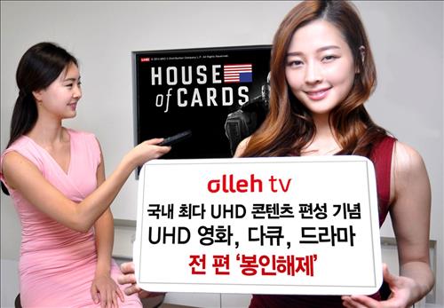 (서울=연합뉴스) 박창욱 기자 = KT[030200]의 IPTV서비스 올레tv가 26~28일을 `UHD-데이'로 정하고 초고화질(UHD) 콘텐츠 전 편을 무료로 서비스한다고 26일 밝혔다.