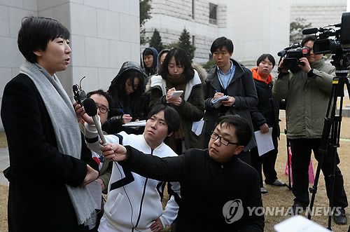 | △ 대법, KTX 여승무원 근로자지위확인소송 파기환송 (서울=연합뉴스) 이지은 기자 = 김승하 KTX 승무지부장이 26일 오전 서울 서초구 서초동 대법원에서 입장 발표를 하고 있다. 이날 한국철도공사(코레일) 자회사인 한국철도유통에서 해고된 KTX 여승무원들은 해고가 무효라며 코레일을 상대로 낸 소송에서 패소 취지 판결을 받았다. |