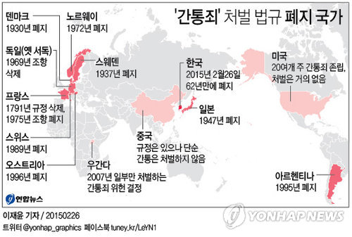 | △ <그래픽> '간통죄' 처벌 법규 폐지 국가 (서울=연합뉴스) 이재윤 기자 = 26일 국가가 법률로 간통을 처벌하는 것은 국민의 기본권을 침해하는 것으로 위헌이라는 헌법재판소 판단이 나왔다. 간통죄 처벌 규정은 제정된지 62년 만에 폐지됐다. yoon2@yna.co.kr 페이스북 tuney.kr/LeYN1 트위터 @yonhap_graphics |