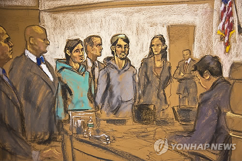 | △ FBI, IS 동조 '잠재 테러리스트' 조사 (AP=연합뉴스) 이슬람 급진주의 무장단체인 '이슬람국가'(IS)에 가담하려다 체포된 미국 뉴욕 거주 아크로르 사이다크메토프(19·카자흐스탄, 왼쪽 3번째), 압두라술 하사노비치 주라보프(24·우즈베키스탄, 오른쪽 4번째)가 25일(현지시간) 뉴욕 브루클린 지방법원 법정에 출두한 모습을 스케치한 것. |