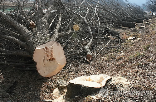 | △ 벌목된 아름드리 은행나무 가로수 (옥천=연합뉴스) 박병기 기자 = 충북 옥천군 안내면 현리의 국도 37호 변에서 베어진 아름드리 은행나무 가로수. 이곳에서는 도로확장을 앞두고 25∼26일 지름 1m 넘는 은행나무 57그루가 잘려나갔다.2015.2.26 bgipark@yna.co.kr |
