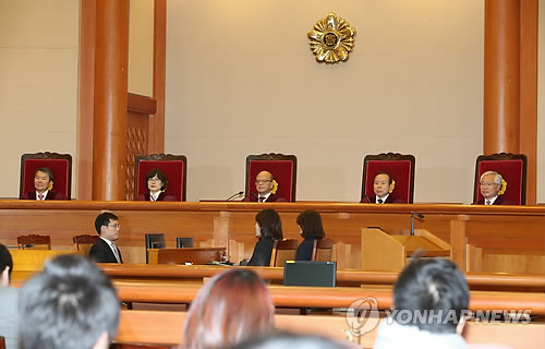 | △ 간통죄 62년 만에 폐지 (서울=연합뉴스) 임헌정 기자 = 박한철 헌법재판소장을 비롯한 헌법재판관들이 간통죄 위헌 여부 선고를 위해 26일 오후 서울 종로구 재동 헌법재판소 대심판정으로 들어선 뒤 자리에 앉아 있다. 헌재는 이날 간통을 처벌하도록 한 형법 제241조가 위헌이라고 선고했다. 헌법재판관 9명 중 7명이 위헌 의견을 내놨다. |