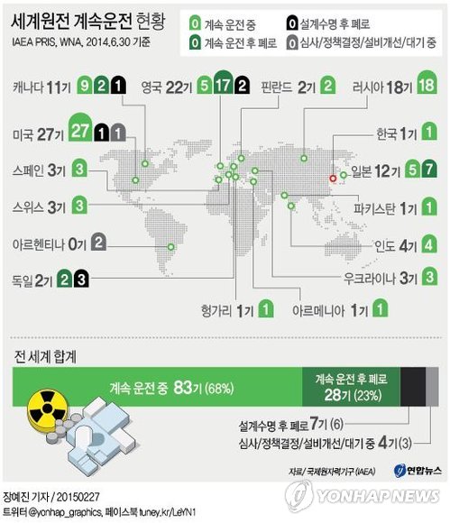 전 세계에서 후쿠시마 사고 이후 건설이 시작된 원전은 21기, 계속운전 승인을 받은 원전은 18기다.