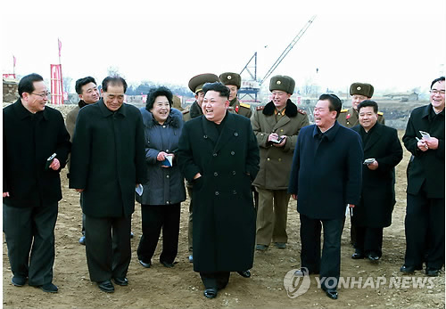 | △ 김정은, 평양 과학기술전당 시찰 (서울=연합뉴스) 김정은 북한 국방위원회 제1위원장이 평양 대동강 쑥섬의 과학기술전단 건설장을 현지지도했다. 노동신문이 27일 게재한 관련 사진에는 김 제1위원장이 박봉주 내각 총리를 비롯한 간부들과 건설장 곳곳을 둘러보는 모습이 담겼다. 2015.2.27 nkphoto@yna.co.kr |